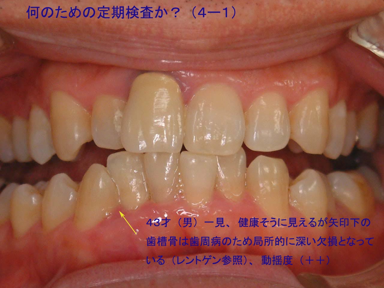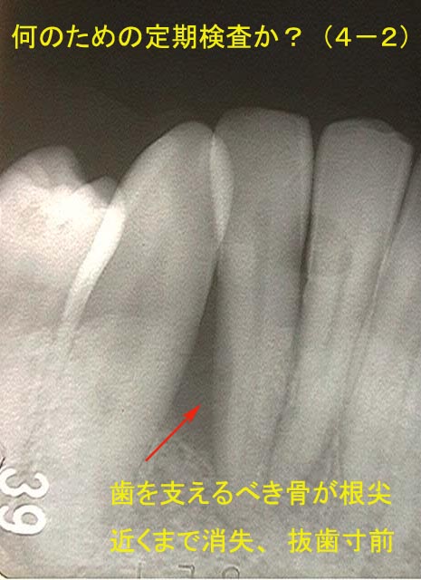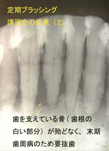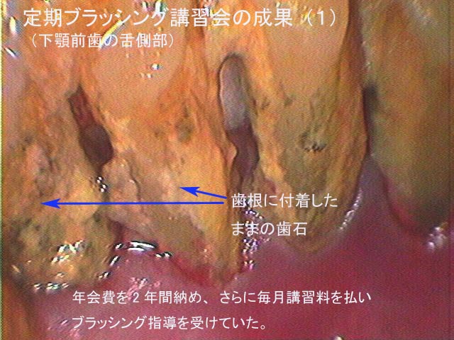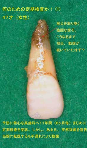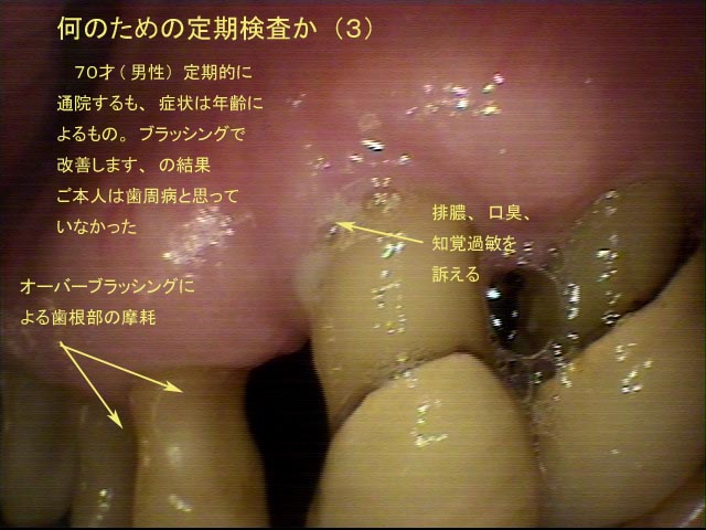 現在、転院されてくる手遅れの患者さんを診ていますと日常的に行なわれている定期検査の在り方に多大な疑問を感じます。同様にブラッシング指導についても熱心な指導はよいとしても指導効果の検証がされていないために患者さんの歯の摩耗が多々みられます。