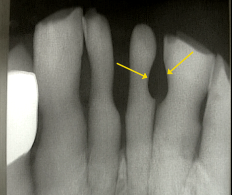 Phot―3.、Xray―1.からブラッシングによる歯の摩耗(黄矢印)が確認できる。