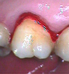 下の画像は簡単に治りそうな軽度な出血です。しかし、2ヶ所の医院を受診してもブラッシングで治る、といわれたが痛みもあり、出血も改善しないため、当院を受診。