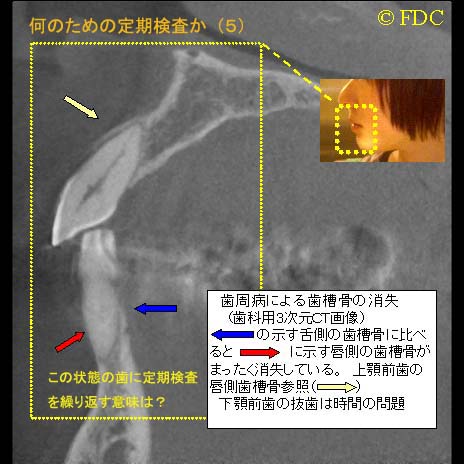 特に、下顎前歯の唇側の骨が病的に破壊されている状態は平面レントゲンでは早期に発見することは不可能です。唇側の歯槽骨は薄いため変化の発見がおくれますと、よほど適切な処置がおこなわれないと歯を喪失することになります。出血がなくとも前歯が動揺する場合はCT撮影が必要です。