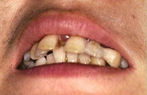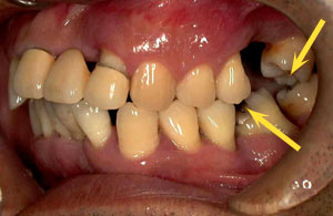 その結果、1本の歯が傾きますと両隣の歯だけでなく対合歯にも影響が波及し歯並びの乱れが目立つようになります(Photo-1)また前歯では反っ歯になり口を閉じて歯が見えるようになります(Photo-2)
