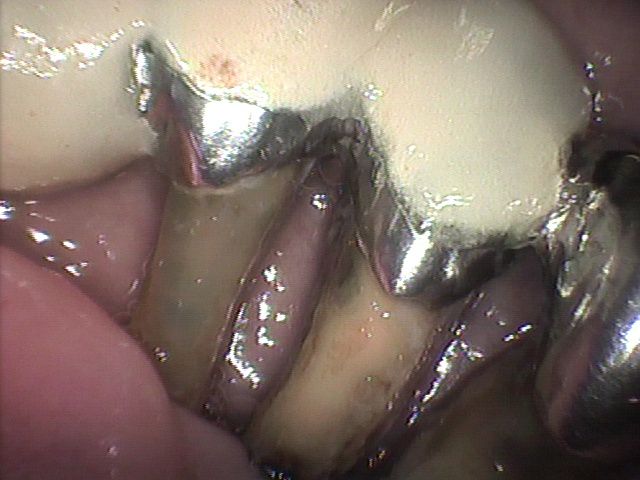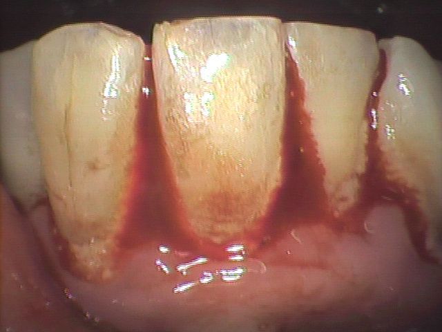 仮固定はタイムリーに実施しますと非常に有効な処置にもかかわらず、ここ十数年の間で重症になられてFDCに転医されている患者さんには、なぜかこの処置をおこなった形跡が見あたらないようです。以下に示します症例はCT読影の結果、歯槽骨の吸収が著しく、そのため強度の歯の動揺、さらに出血も相当ありました。