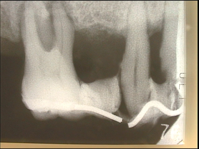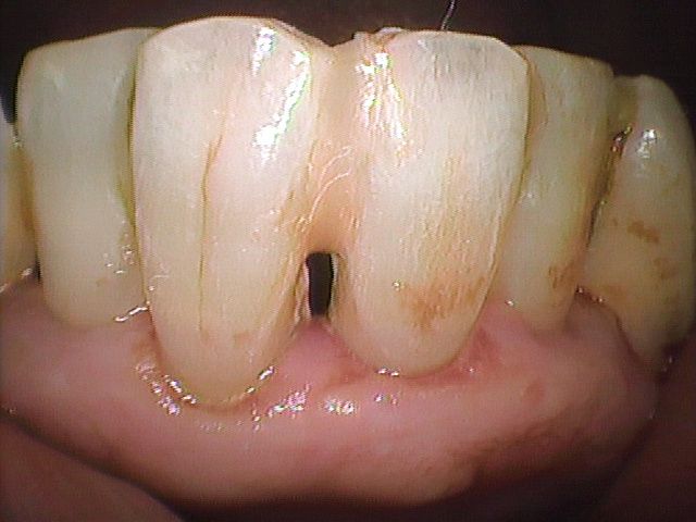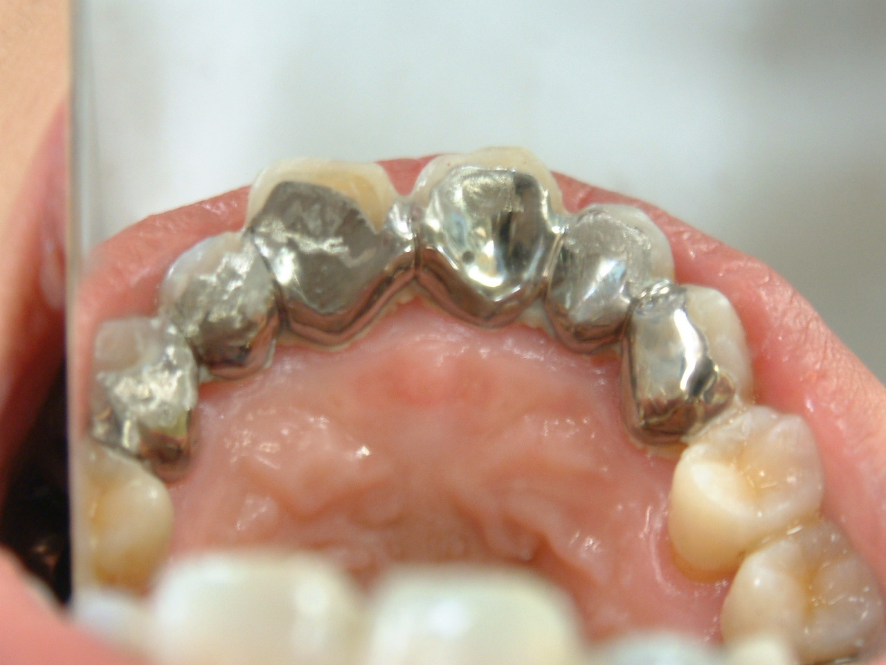 ノウハウもなく単に歯を連結し病原菌除菌も行なわなければ「砂上の楼閣」にすぎません。このような装置は早ければ半年から数年で大きな動揺がみられ腫れや咀嚼困難が生じます。結局、連結歯すべて抜歯することが多いようです「Photo-1」