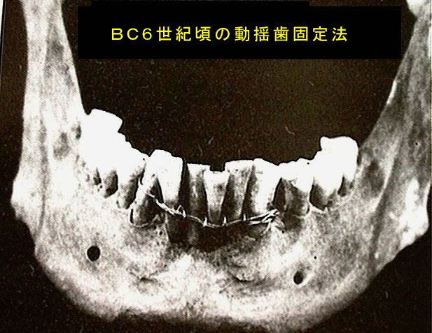 動揺歯を固定する方法は【仮固定と長期固定装置】があります。動揺歯を固定する方法はすでにBC6世紀に行なわれています(Photo-3) 21世紀の現代において、新しい技術でこれらの処置を適切な時期におこなうことによって動揺による歯周病の進行を改善し、歯の喪失を予防することは当然といえます。各々の方法については以下に詳しく述べます。