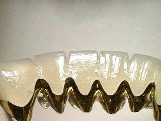 動揺歯を冠で連続的につなぎブラッシングをしっかりすれば良いと誤解された処置が多々みられます。このような固定処置では一時的に歯の動揺がとまりますが依然として腫れや痛みが繰返され短期間で多数歯の抜歯を行なうケースが多いようです。咬合力分散装置は病原菌除菌が行なわれ腫れや痛みの症状の消失後でなければ、このような処置は無意味です。